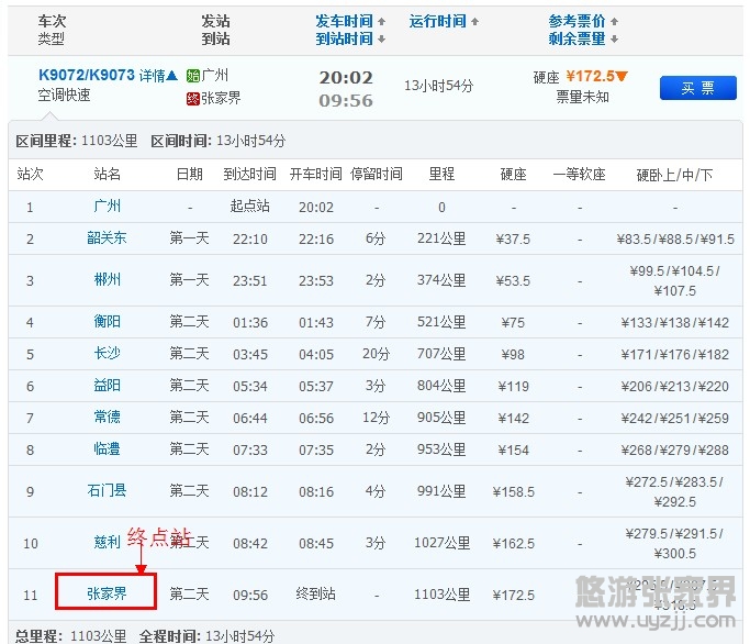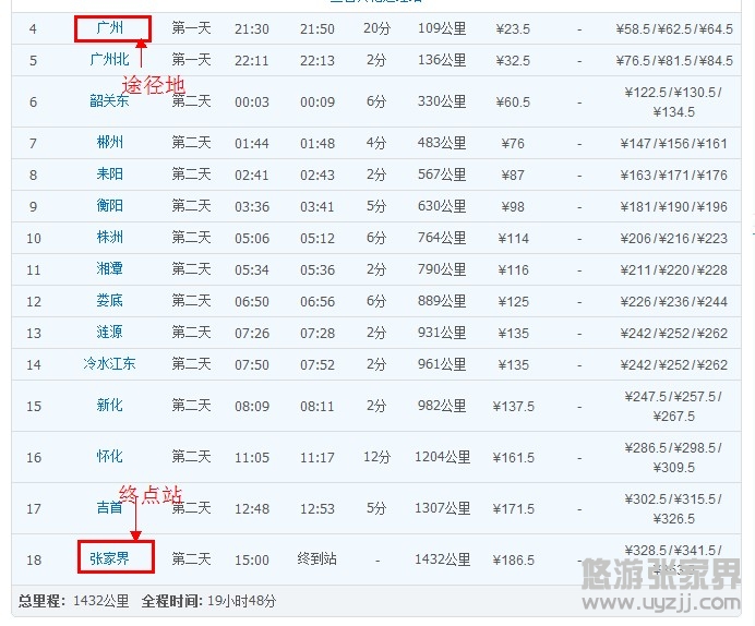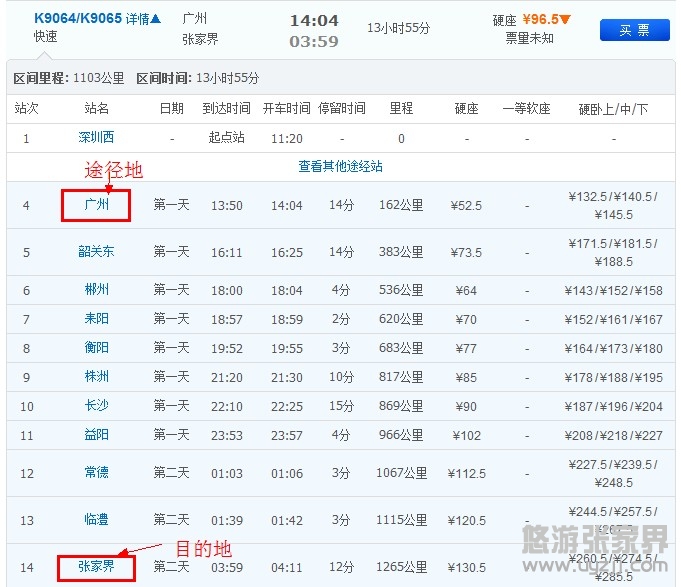 從廣州出發到張家界自由行自助游,一般都是坐火車到張家界,乘車車次有:K9072、K9068、K9064三趟,分別時刻表為: