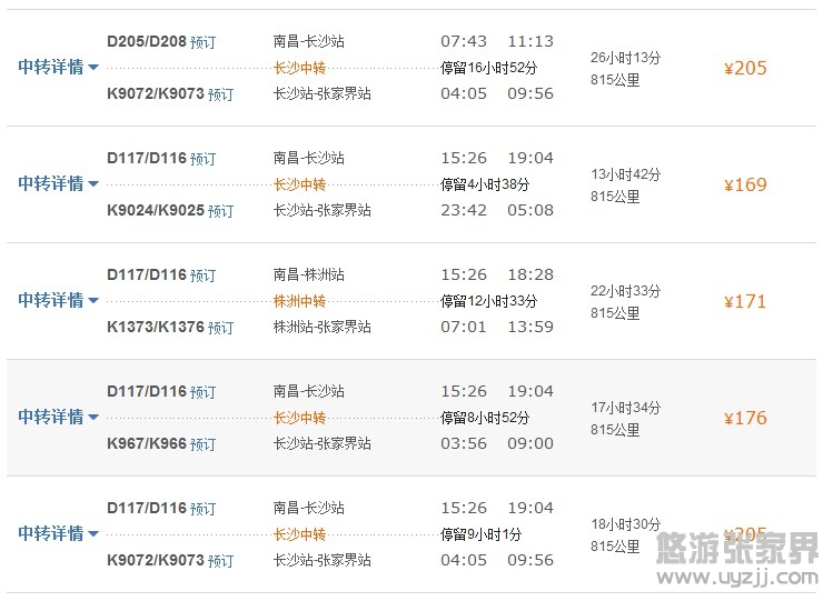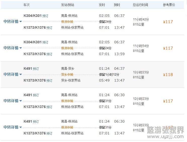 株洲中轉是最為好的中轉方式,株洲停留時間只需半個小時左右,從南昌坐火車到達株洲后即非常方便中轉到張家界,中轉車次如下圖: