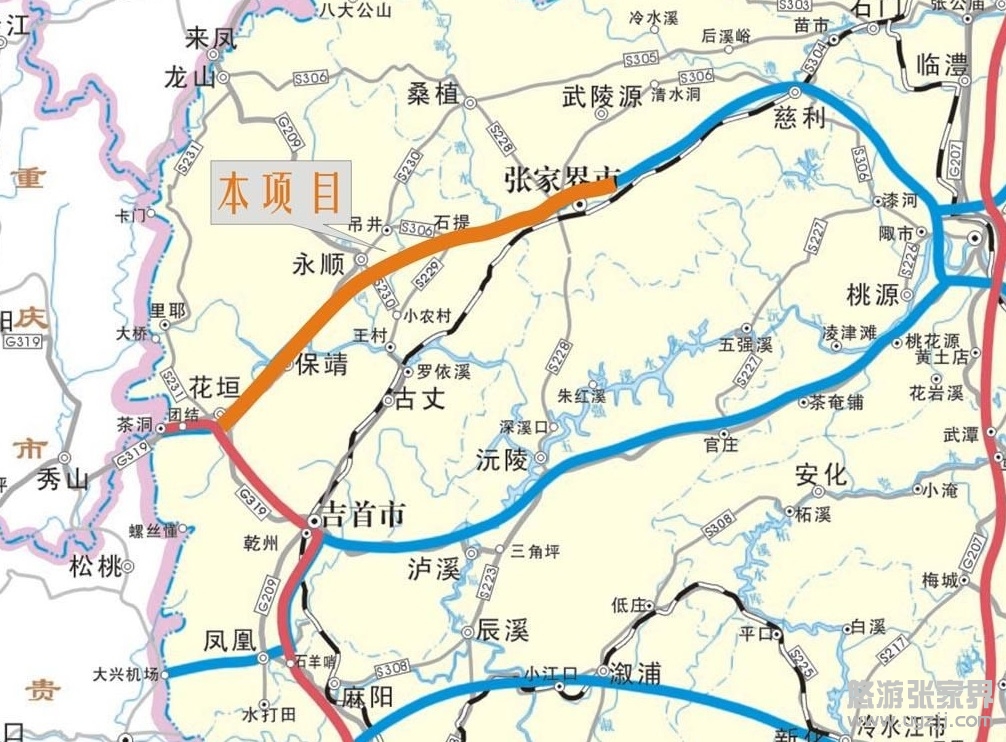 該項(xiàng)目路線起于張家界市陽湖坪鎮(zhèn),終于湘西自治州的花垣縣,順接常張高速公路,經(jīng)吉首大學(xué)邊緣,途經(jīng)張家界市的永定區(qū)、湘西自治州的永順縣、保靖縣、花垣縣。跨省道S306、張清公路及省道S228,經(jīng)三家館、在鴨坪跨澧水、到達(dá)青坪、經(jīng)羊峰,于哈妮宮上游1.2km跨越施河,到撫志,再于海螺電站上游約1公里跨越猛洞河,經(jīng)澤家以南,沿鐘靈山工業(yè)園邊緣,跨酉水,繞過保靖縣城東南梅花鄉(xiāng)規(guī)劃區(qū),沿國道G209布線到復(fù)興鎮(zhèn)跨花垣河,沿花垣規(guī)劃區(qū)西面邊緣經(jīng)卡地至排樓,于吉茶高速公路相接,路線全長146.848km。
