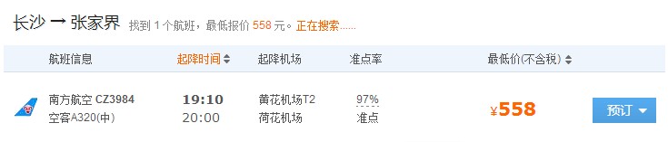 長(zhǎng)沙到張家界航班為每天一班,航班為南方航空CZ3984空客A320(中),起降時(shí)間為19:10-20:00,起降機(jī)場(chǎng)為黃花機(jī)場(chǎng)T2-荷花機(jī)場(chǎng)。